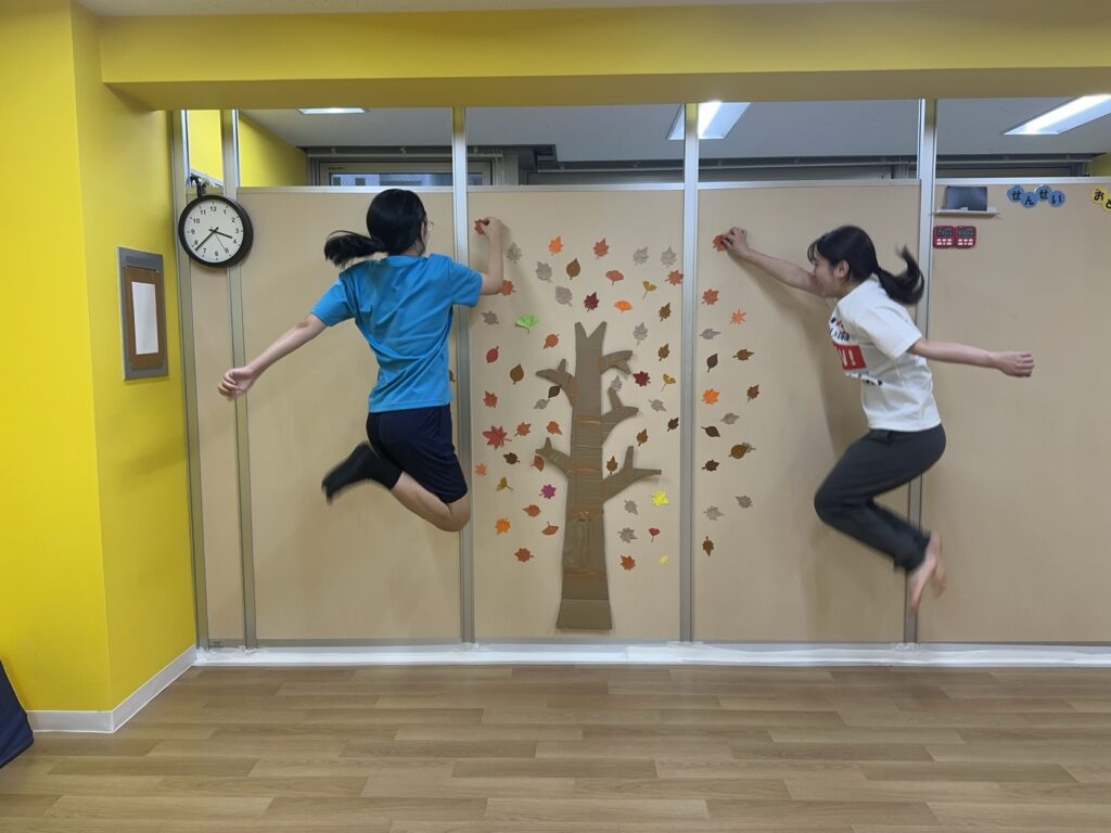 紅葉した葉っぱを取りしゃがんだりジャンプしたり、木に張り付けてきれいな紅葉をみんなで作り上げていきます!