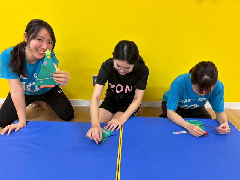 大きなネットで作ったツリーに協力して飾り付けを行いました!
